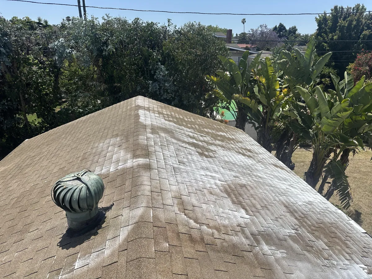 You may see the soft washing "magic results" on youtube or social media, but you won't find any that are actually set in California! Here in SoCal we have our own unique strain of Gleocapsa magma. Our moderate humidity levels promote its growth, but also cause it to embed deep into the tile pores. Chemical soft washing kills the organic material, but low pressure will not completely rinse it away. The only way to completely clean roof tiles in California is with an herbicide treatment and pressure rinse. This process is required to get avoid homeowners insurance non-renewals and/or cancellations.