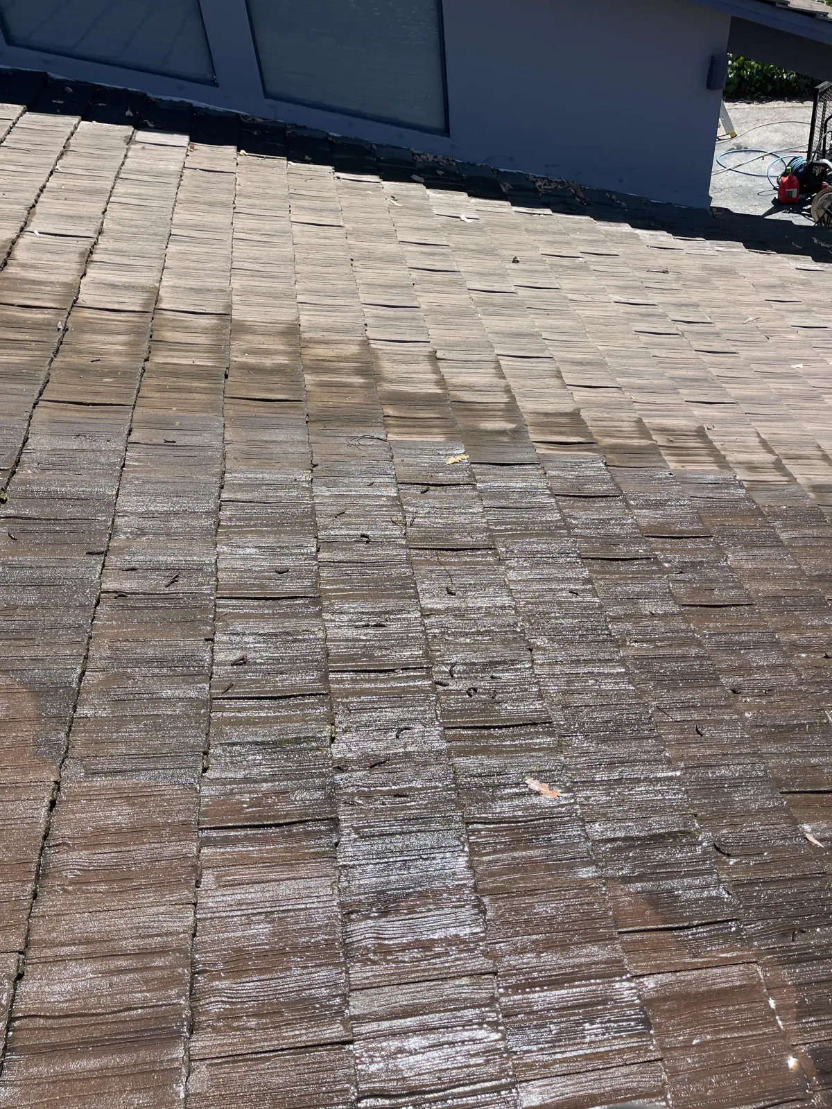 • Chemicals are required to clean asphalt/composite roofs, stone coated metal roofs, and cedar shakes wood roofs. We offer a chlorine based bleach soft wash, or a non-toxic oxygen based bleach alternative for these roof types.