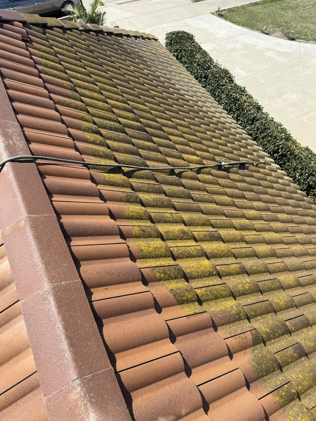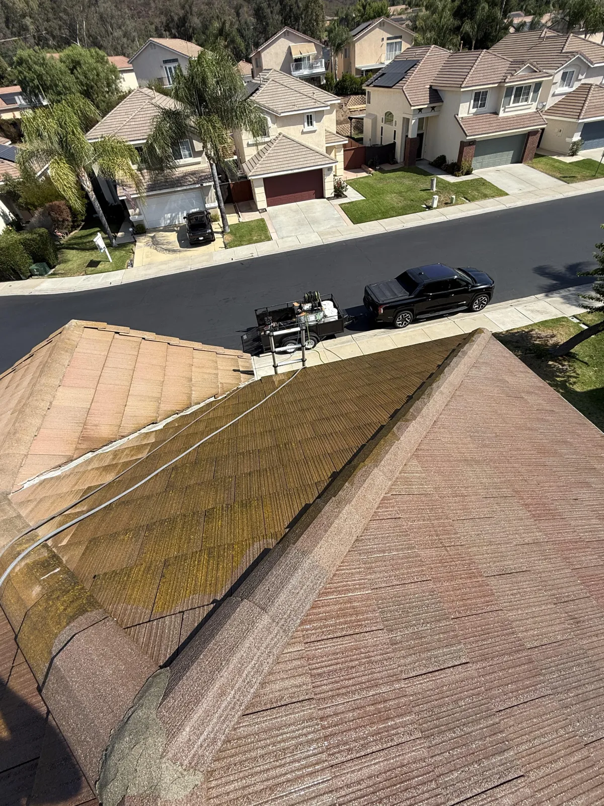 You may see the soft washing "magic results" on youtube or social media, but you won't find any that are actually set in California! Here in SoCal we have our own unique strain of Gleocapsa magma. Our moderate humidity levels promote its growth, but also cause it to embed deep into the tile pores. Chemical soft washing kills the organic material, but low pressure will not completely rinse it away. The only way to completely clean roof tiles in California is with an herbicide treatment and pressure rinse. This process is required to get avoid homeowners insurance non-renewals and/or cancellations.